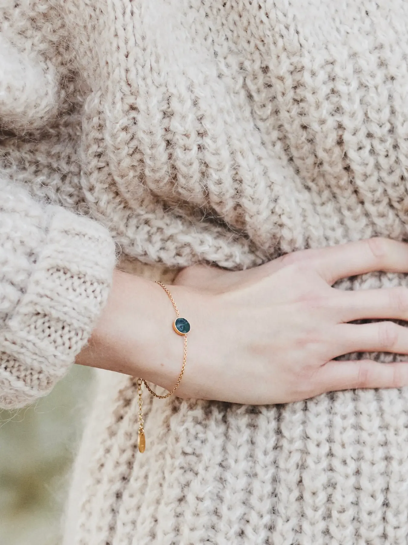 Bransoletka z ciemnozielonym kamieniem na delikatnym złotym łańcuszku będzie piękną ozdobą Twojego nadgarstka. Bransoletka jest lekka, wygodna i świetnie sprawdza się jako dodatek na co dzień, ale też w towarzystwie bardziej eleganckich elementów garderoby.