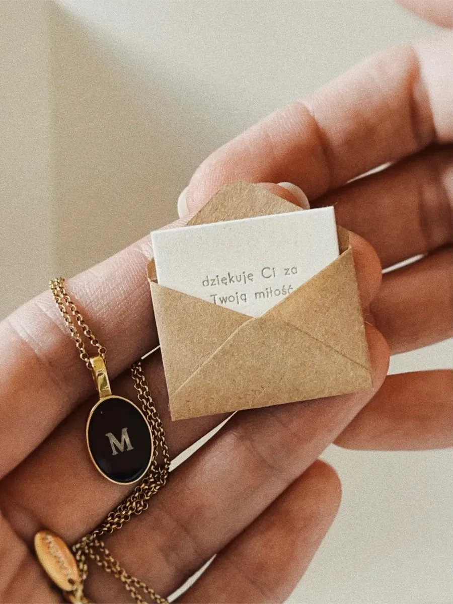 Ta miniaturowa karteczka w kopercie z dedykacją to uroczy, pełen ciepła akcent, który uczyni Twój prezent jeszcze bardziej osobistym i wyjątkowym. Idealnie komponuje się z biżuterią, podkreślając emocje ukryte w drobiazgu.