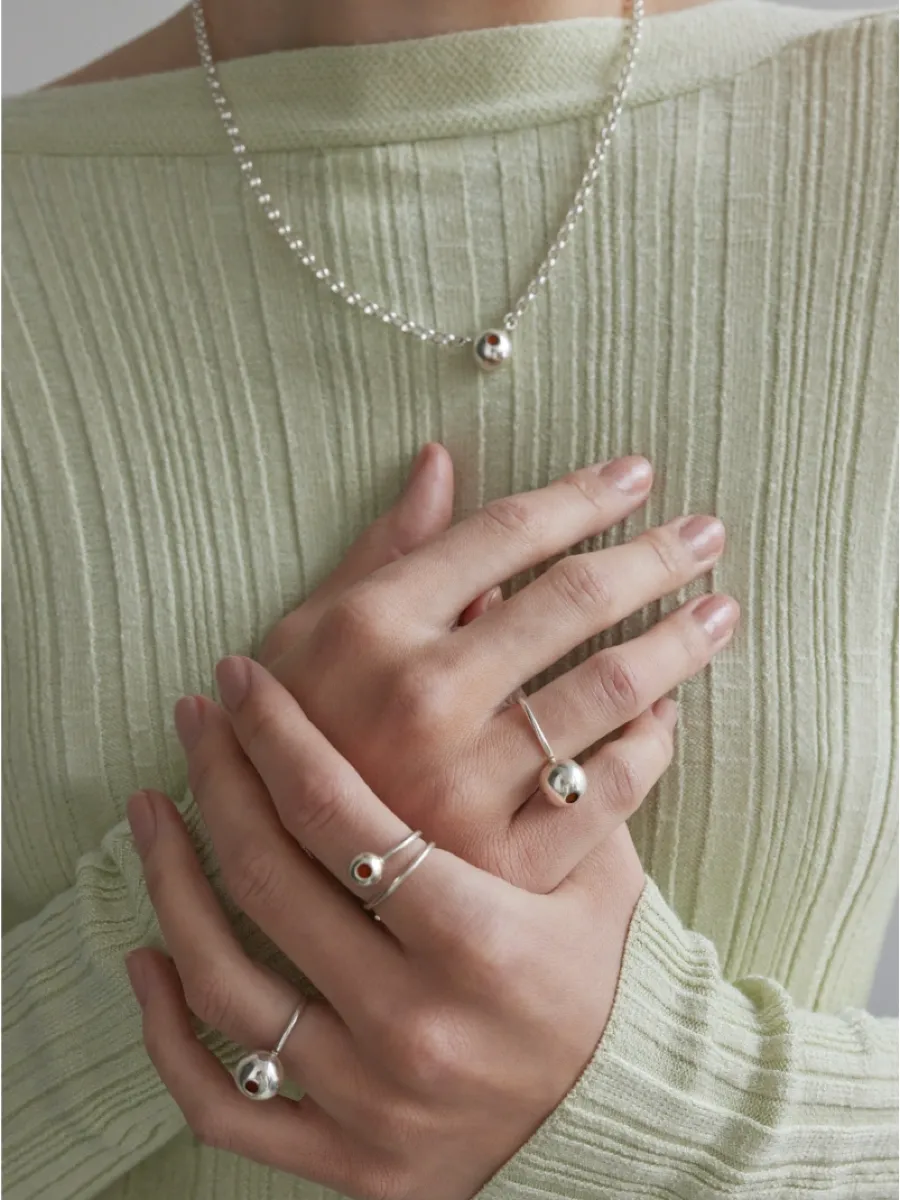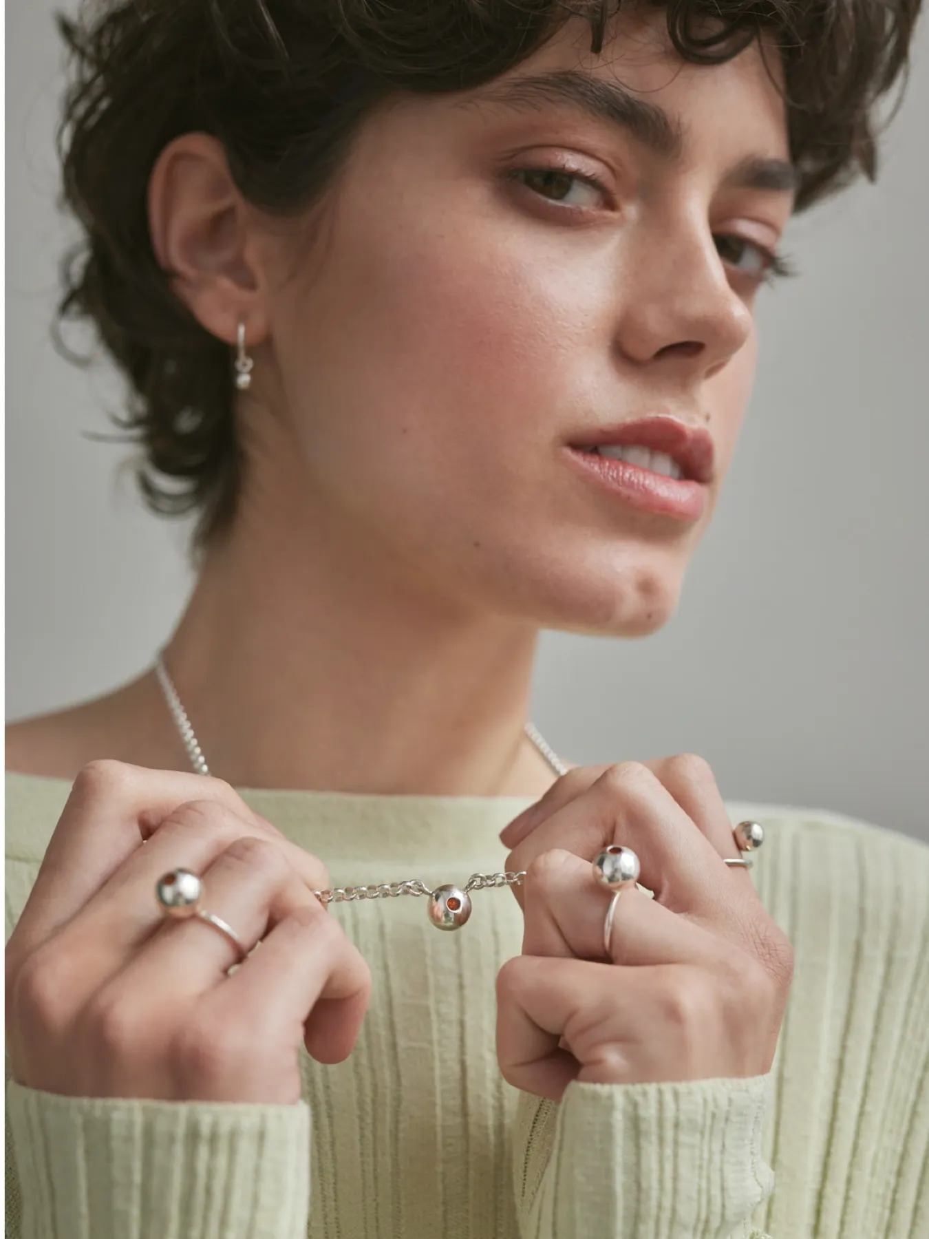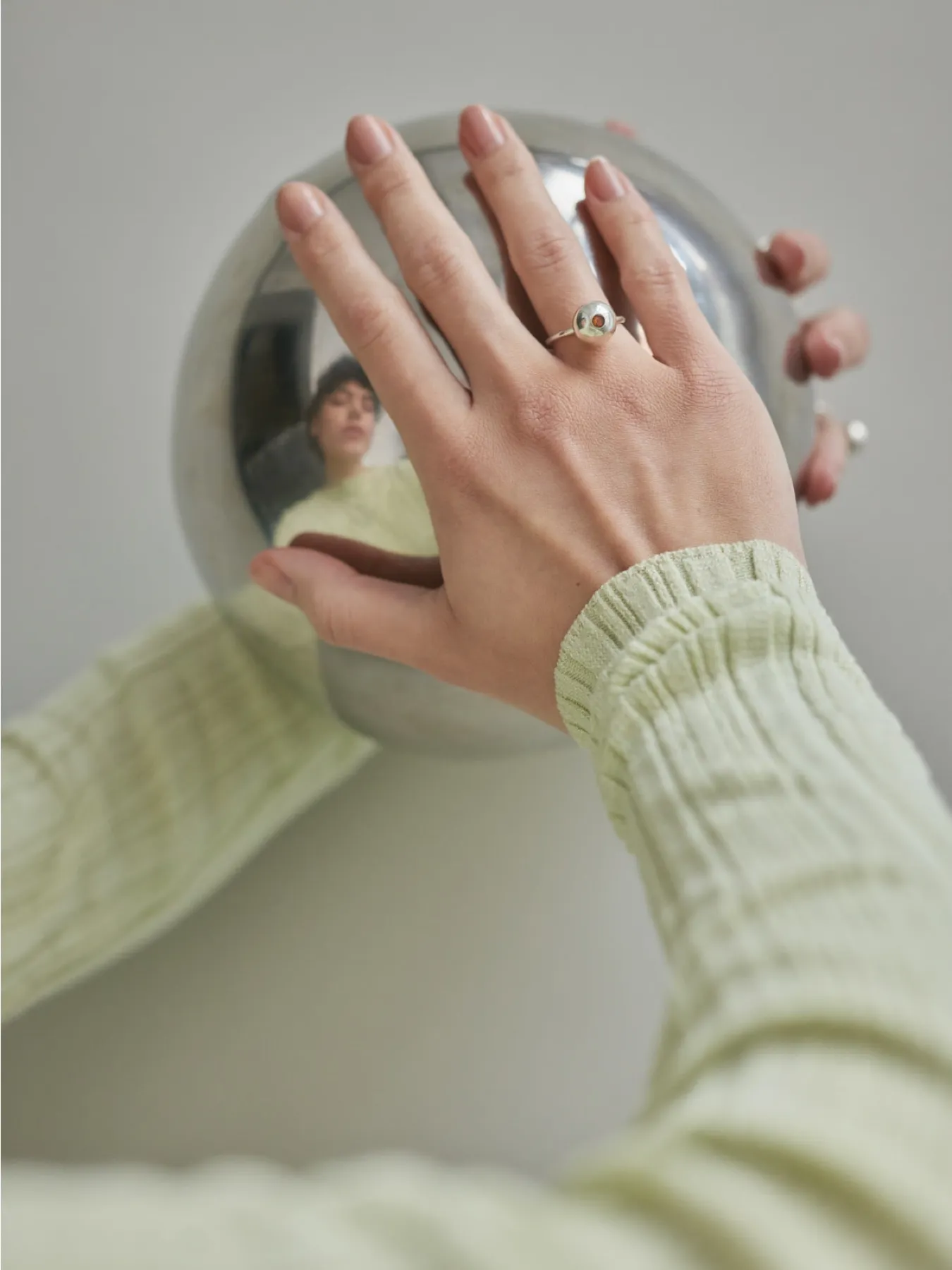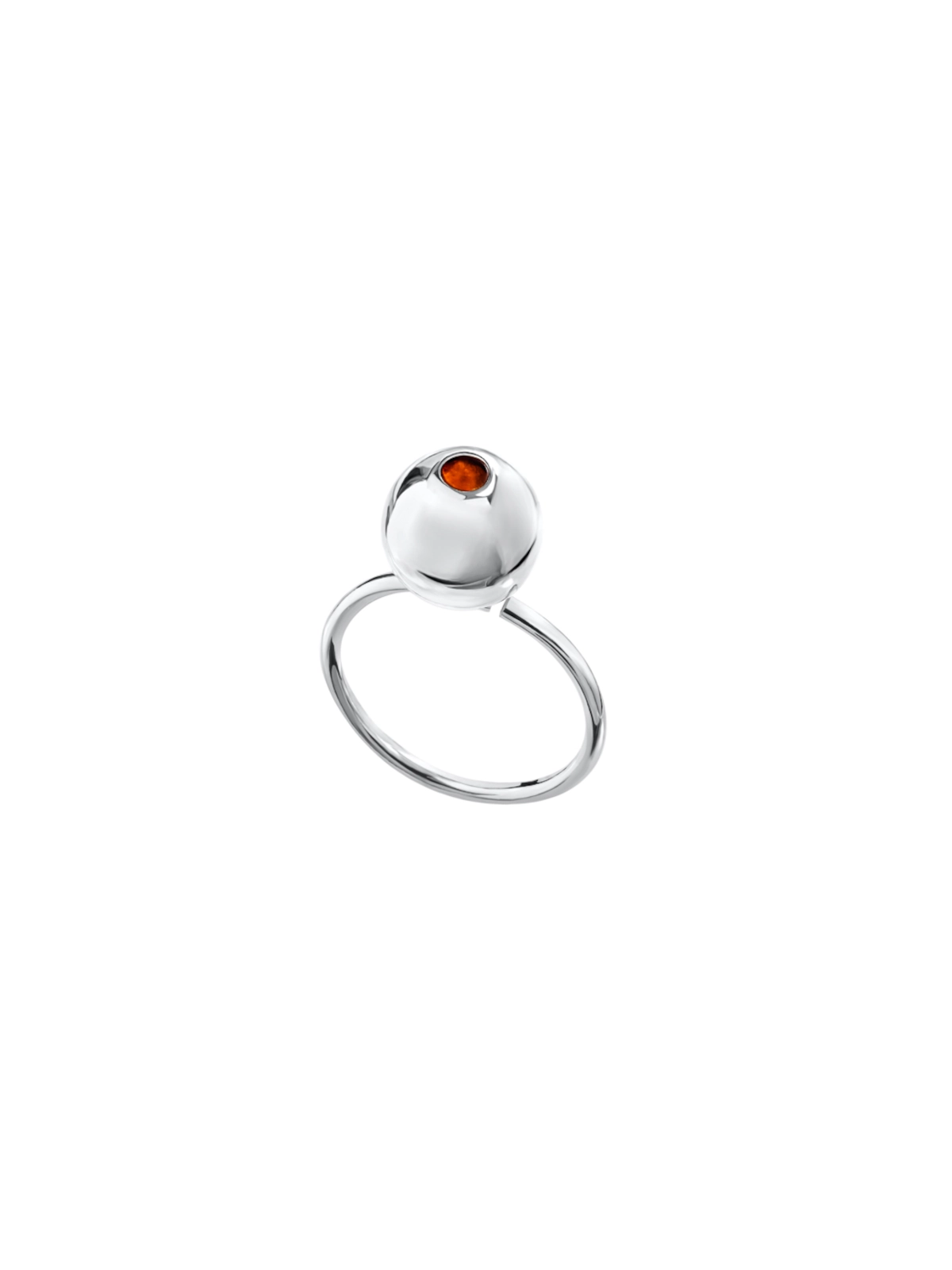 Ten pierścionek z dużą, przestrzenną kulą to propozycja dla osób, które cenią niebanalne formy i biżuterię z charakterem. Ręcznie formowane srebro i bursztyn tworzą harmonijną kompozycję – współczesną, ale z duszą.
