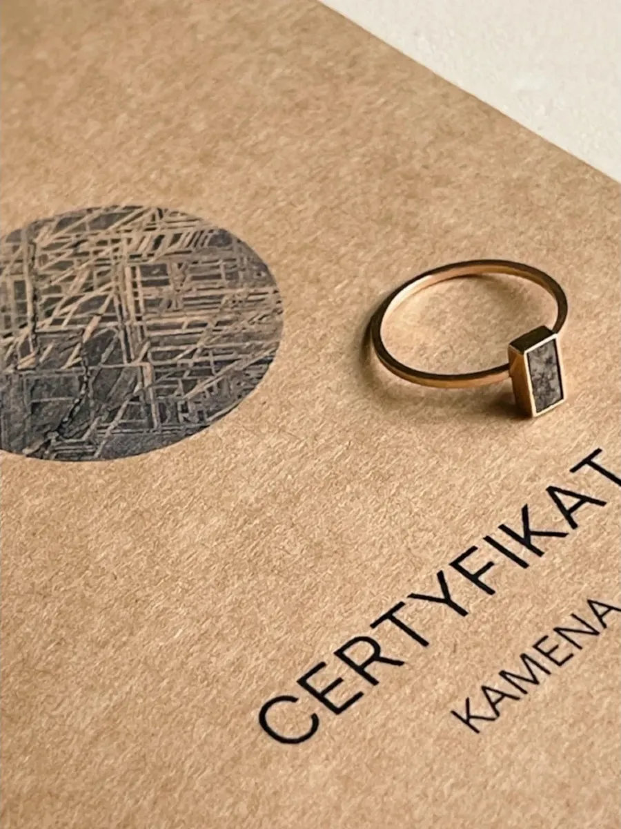 Ten pierścionek nie pochodzi z tej Ziemi – dosłownie. W jego centrum znajduje się autentyczny fragment meteorytu, który spadł na teren dzisiejszego Moraska niczym gwiazdka z nieba. Oprawa prostokątnego meteorytu i delikatna obrączka z różowego złota łączą się w ręcznie wykonanym pierścionku – biżuterii pełnej symboliki i elegancji.