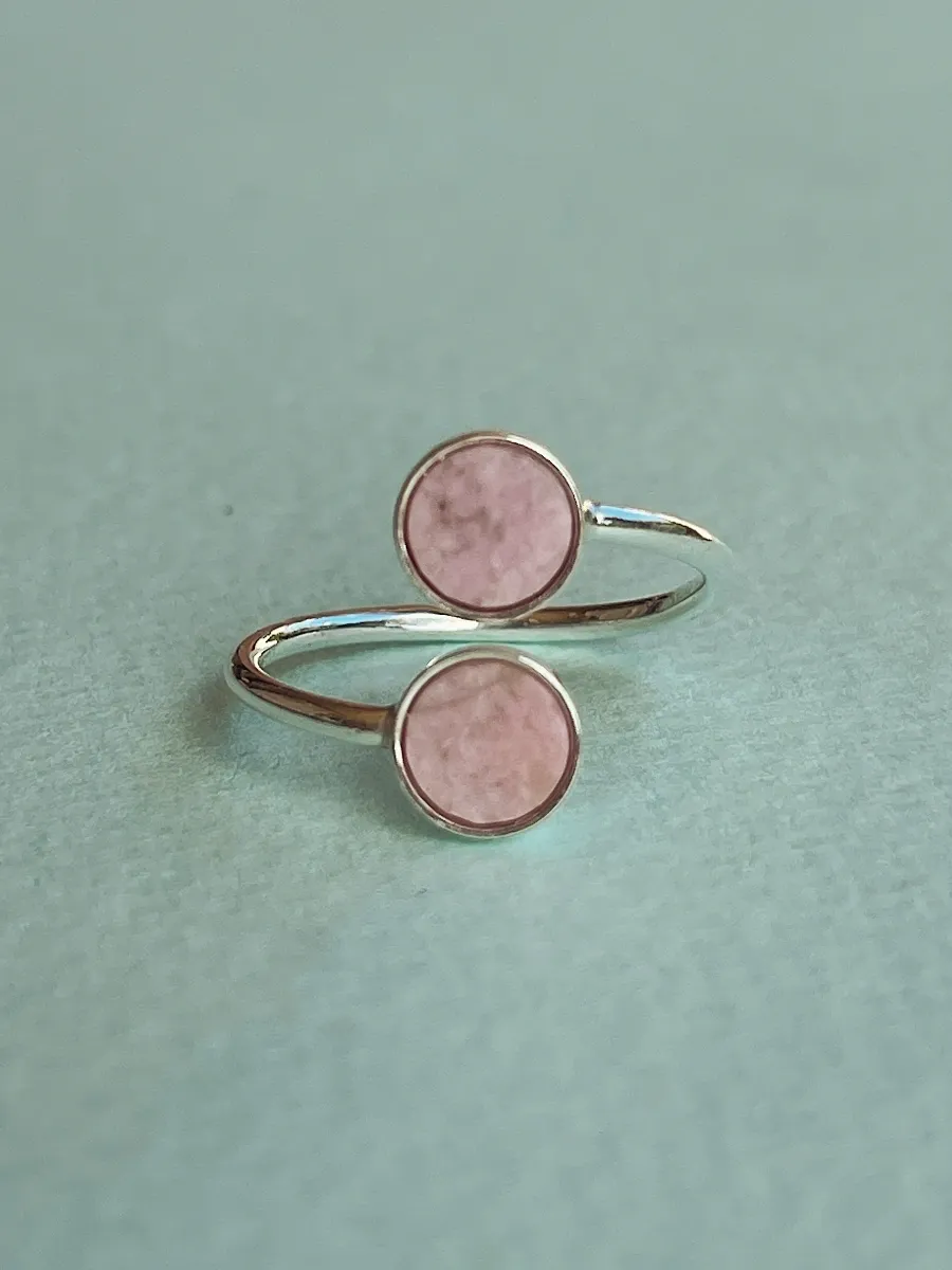 Ten delikatny pierścionek z dwoma kamieniami zachwyca prostotą i kobiecą energią. Jego otwarta forma daje poczucie lekkości, a różowy odcień rodingitu subtelnie rozświetla dłoń. Idealny, jeśli szukasz biżuterii, która łączy naturalność z wygodą noszenia.