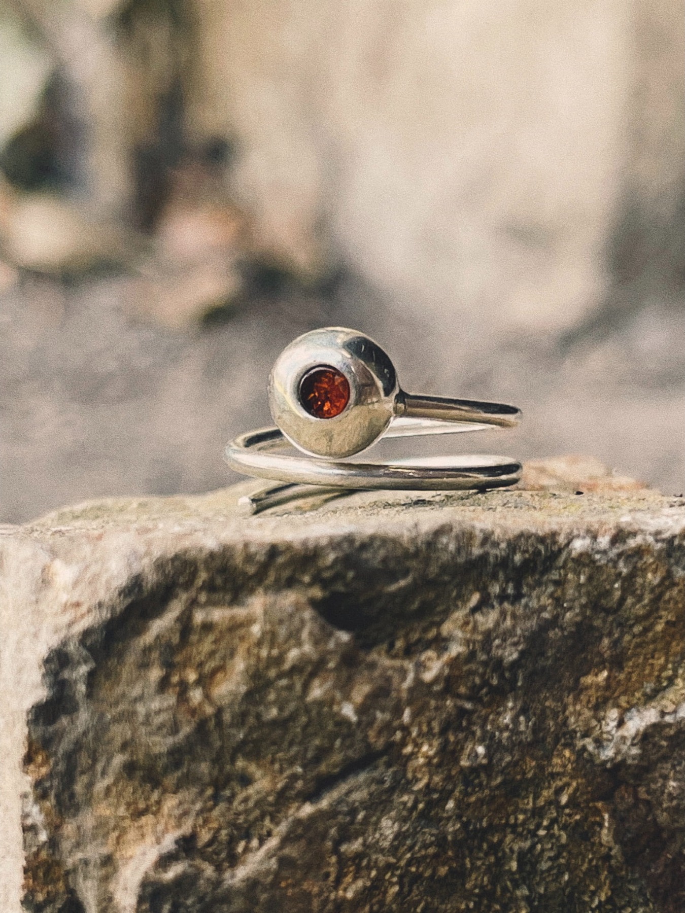 Srebrny pierścionek spiralny z bursztynem – ruch i światło w detalu