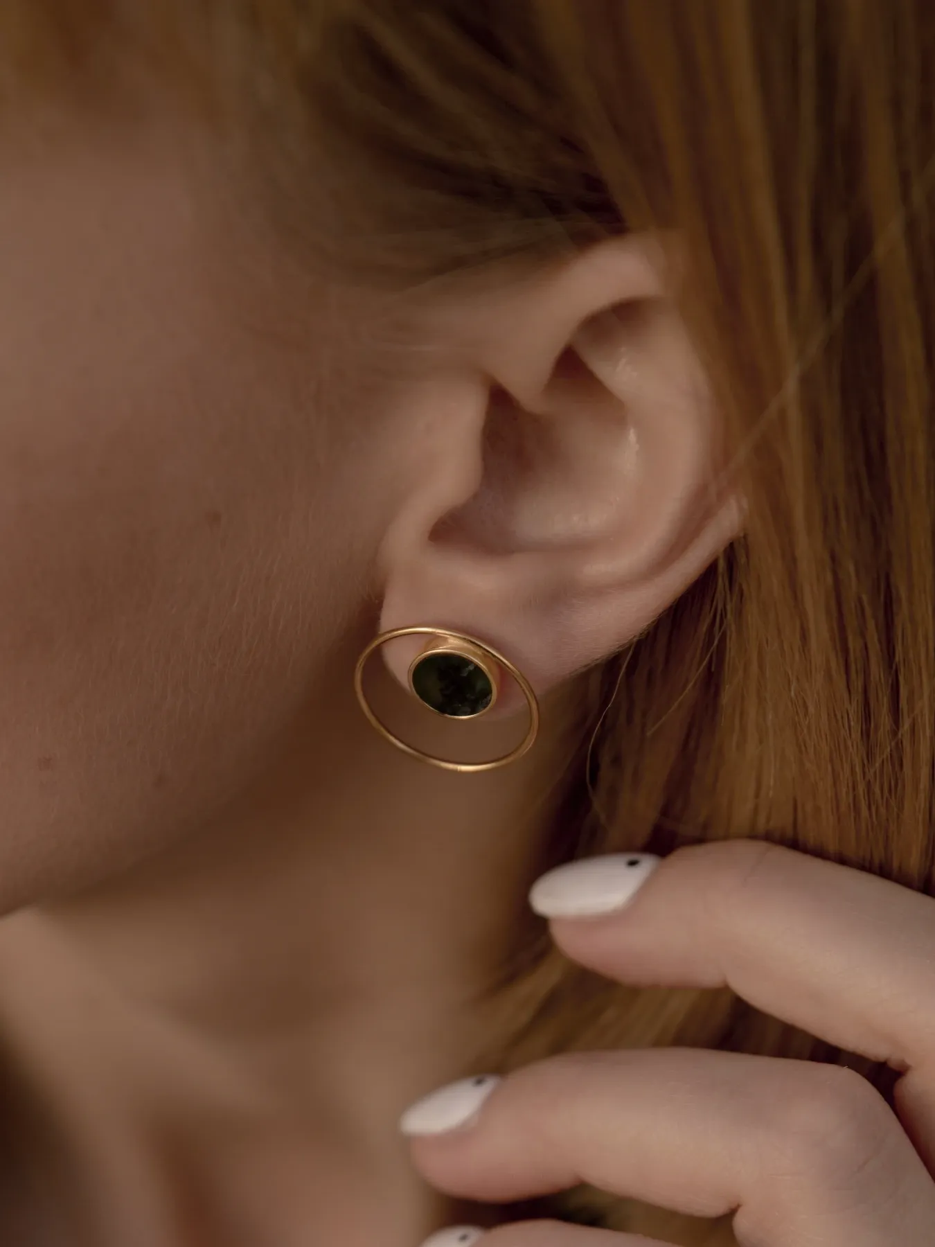 Motyw koła od wieków symbolizuje kompletność, harmonię i kobiecość. W tych kolczykach z żółtego złota próby 585 ten klasyczny kształt zyskuje nowoczesny charakter, podkreślając głębię naturalnego nefrytu z Dolnego Śląska – kamienia o szlachetnej, ciemnozielonej barwie i subtelnej marmurkowej strukturze.