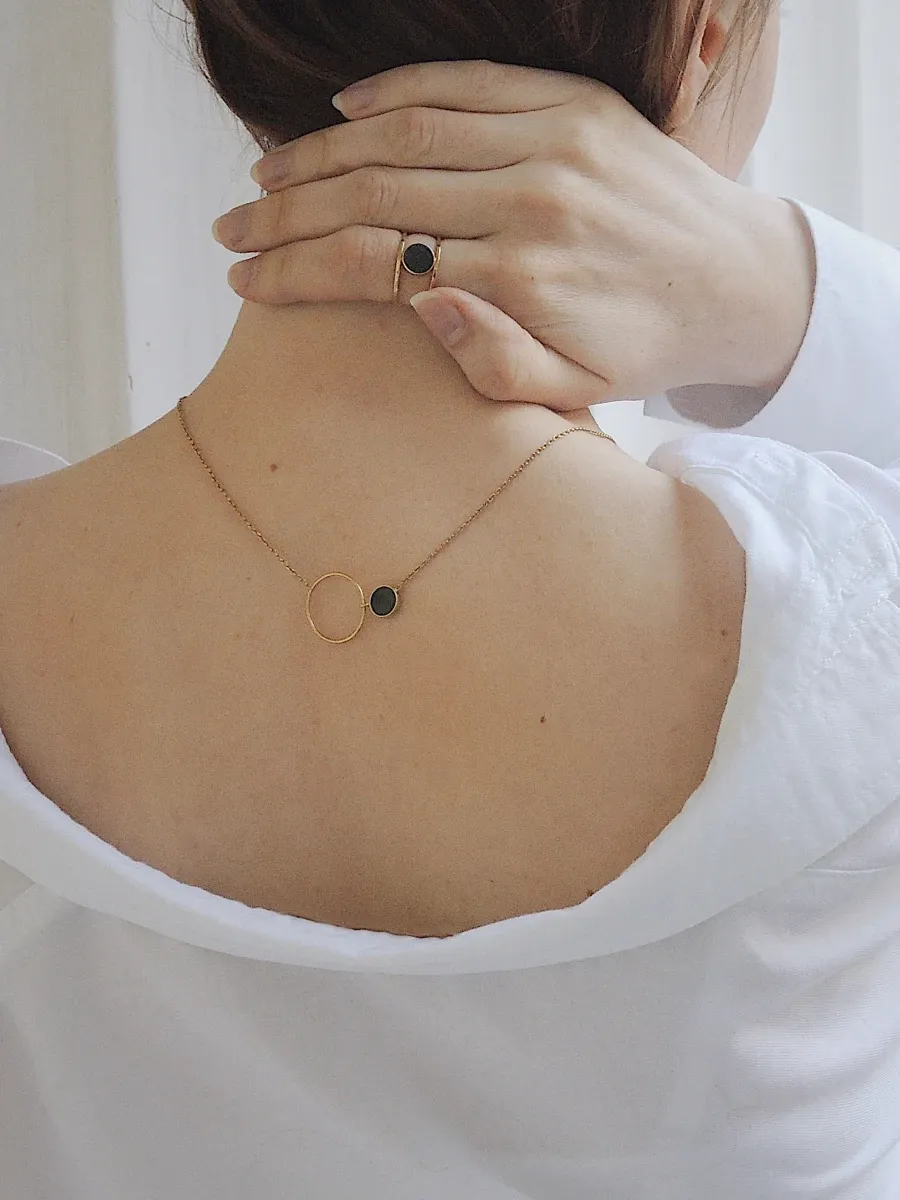 Perfekcyjny kształt koła od wieków symbolizuje kompletność, równowagę i zmysłowość. W tym naszyjniku z żółtego złota próby 585 motyw ten nabiera nowoczesnego wyrazu, tworząc formę prostą, ale pełną znaczenia. Centralnym punktem projektu jest zielony kamień naturalny z Dolnego Śląska o subtelnej, marmurkowej strukturze.