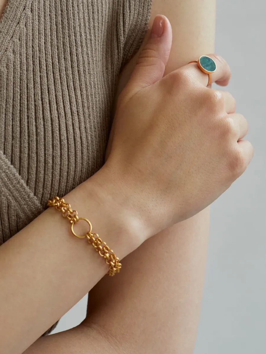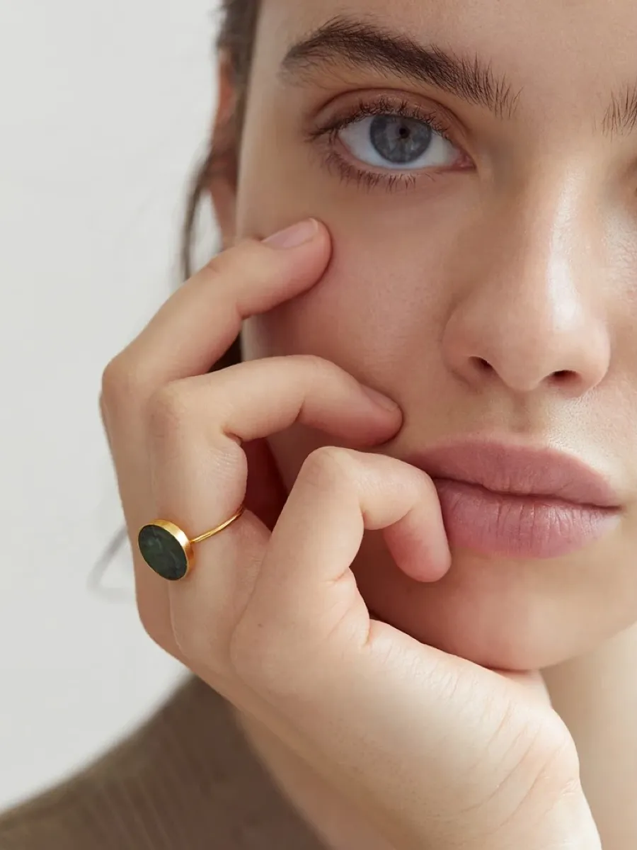 Ten model przyciąga spojrzenia — duży, okrągły kamień osadzony w złoconej oprawie to propozycja dla osób, które szukają mocnych biżuteryjnych akcentów, ale w klasycznym stylu. Prosta konstrukcja pierścionka wydobywa głębię zieleni kamienia, tworząc kompozycję, obok której nie da się przejść obojętnie.